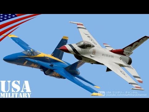 The Thunderbirds fly the F-16 Fighting Falcon while the Blue Angels fly the F/A-18 Hornet. The F-16 first entered service in 1979 while the F/A-18 first flew in 1978.