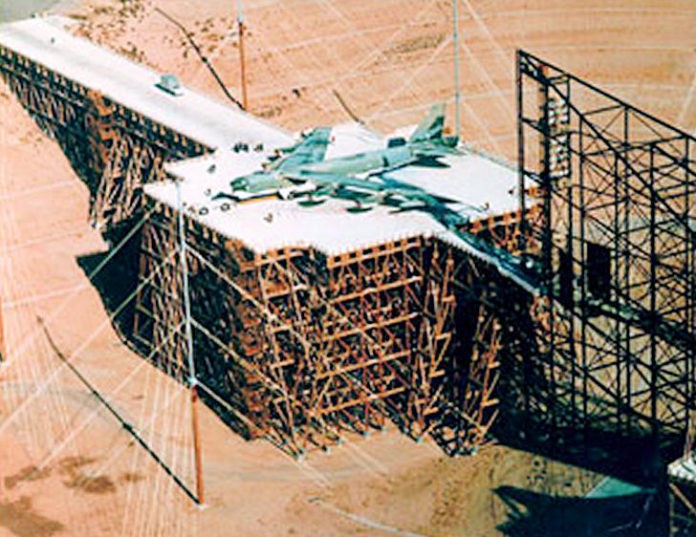 - A giant wooden trestle built in a bowl-shaped arroyo, designed to elevate the test aircraft above ground interference and orient it below the pulse in a similar manner to what would be seen in mid-air.