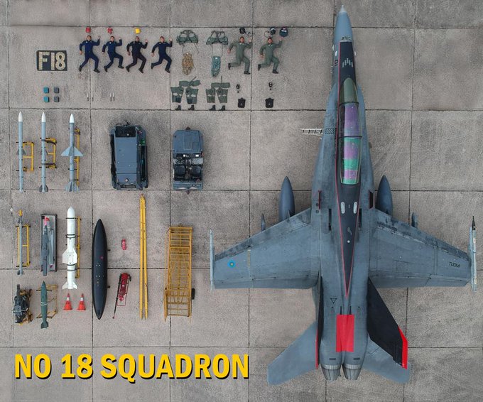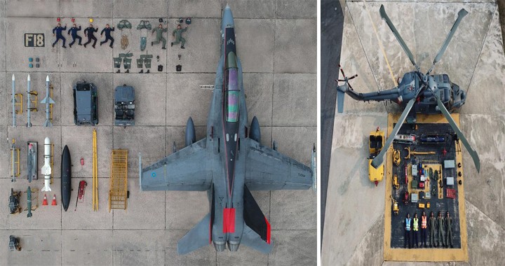 Six RMAF personnel, an F18 complete with sidewinder missiles, and various equipment and uniform items used were laid out in the creative effort.