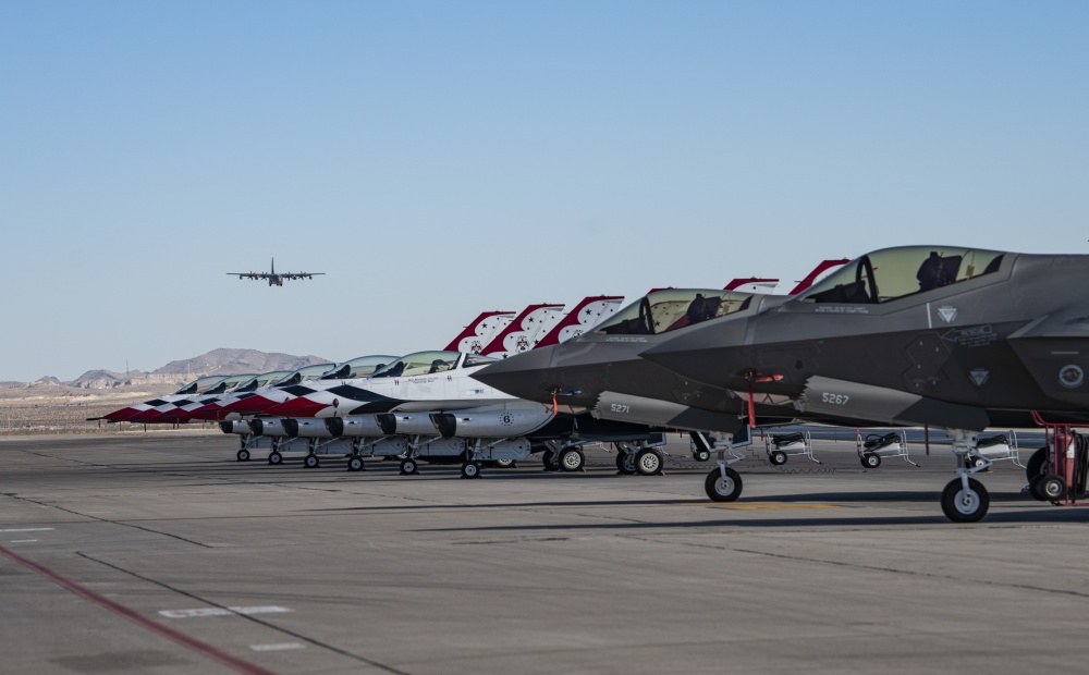 U.S. Air Force “Thunderbirds” and an F-35 Lightning II fighter jet during Aviation Nation at Nellis AFB. (U.S. Air Force photo by Airman 1st Class Bailee A. Darbasie)