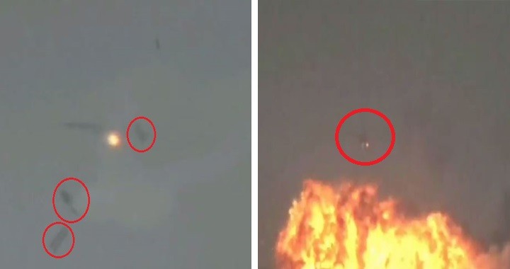The video shows the two detachable fuel tanks and practice bombs known as Carrier Bomb Light Stores (CBLS) pods being dropped off from the plane, triggering an explosion and a ball of fire that set the dry bushes near the runway ablaze, leaving the area covered with smoke.