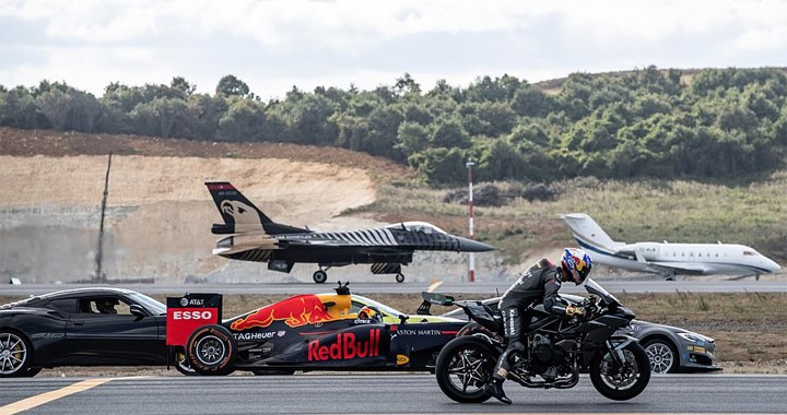 Although the Red Bull Formula 1 car gave him a run for his money, ultimately Supersport World Champion Kenan Sofuoglu, from Turkey, rode his Kawasaki H2R motorcycle to victory in the epic race.