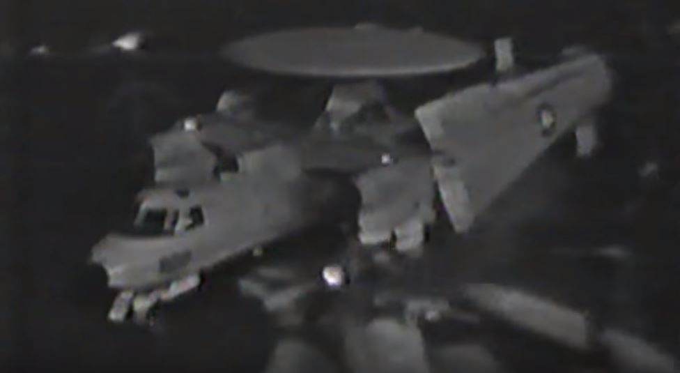 Taken during Operation Desert Storm on board USS Saratoga (CV-60), the shocking video in this post-show is a VAW-125 Tigertails E-2C Hawkeye sliding on the oily flight deck while taxing aft to the waist catapults.