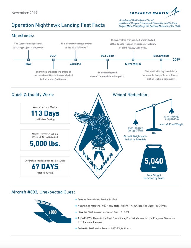 The joint project referred to as “Operation Nighthawk Landing” was made possible by a permanent loan to the Reagan Foundation from the National Museum of the U.S. Air Force. To support the Air Force in their loan, the Lockheed Martin Skunk Works is restoring the aircraft in preparation for its permanent exhibition at the Reagan Library.