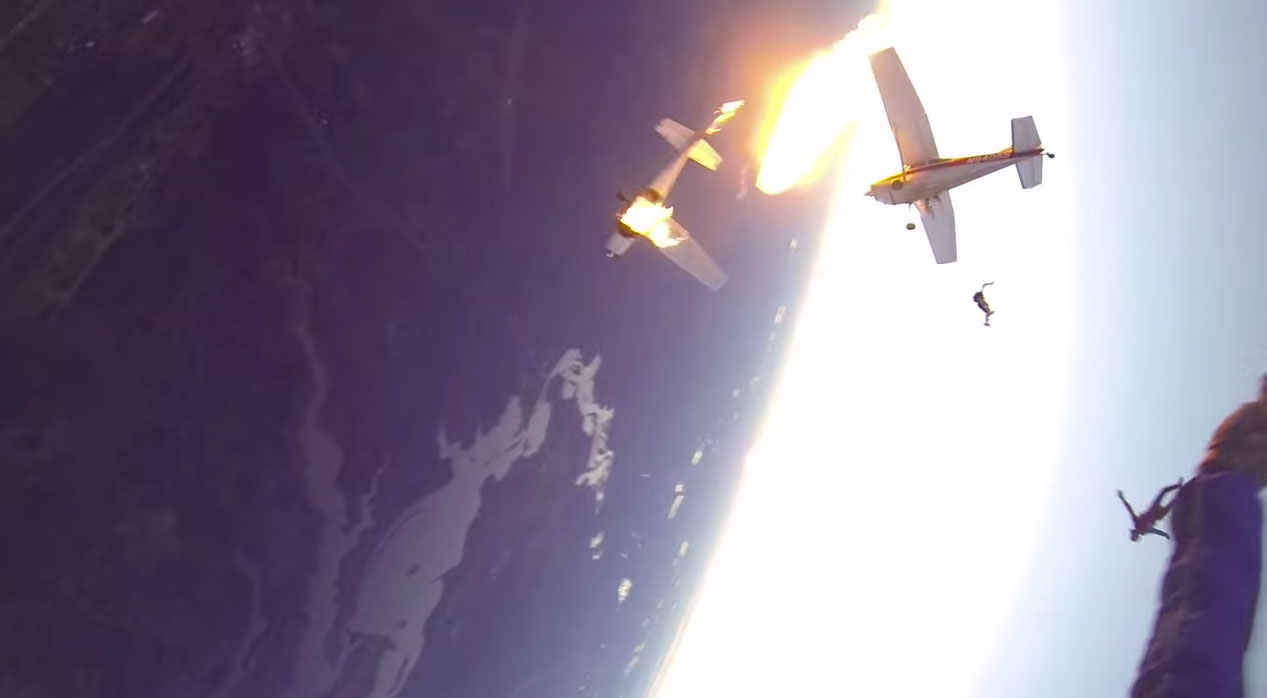 The two sky-divers preparing to jump from the bottom plane immediately fall out – as they look backward they capture astonishing images of the two planes burning and falling- with the other skydivers still emerging.