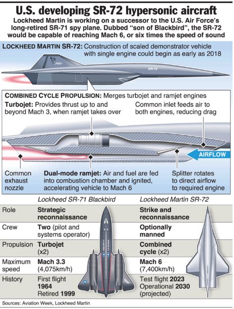Lockheed’s division for advanced aircraft development commonly referred to as the Skunk Works, told Aviation Week that producing a formidable replacement for the SR-71, which was retired in 1998, has been delayed as they waited for hypersonic technologies to improve. Now, a new combined-cycle propulsion system that merges a supersonic jet engine with a rocket promises to offer the SR-72 performance that leaves its namesake in the proverbial dust. While the SR-71’s record-setting top speed is said to have exceeded MACH 3 (approximately 2,300 miles per hour) the SR-72, equipped with two hybrid jet/rocket engines could potentially surpass MACH 6 – depending on the aircraft’s design being able to manage the friction created by air traveling over its control surfaces at such high speeds.