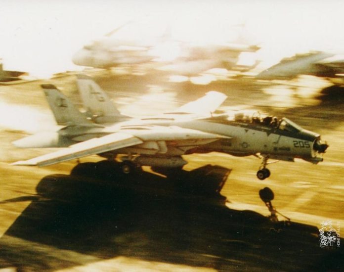 on Nov. 13, 1991, U.S. Navy Grumman F-14B Tomcat (BuNo 161433) from Fighter Squadron 142 (VF-142) “Ghost Riders” aboard the aircraft carrier USS Dwight D. Eisenhower (CVN-69).