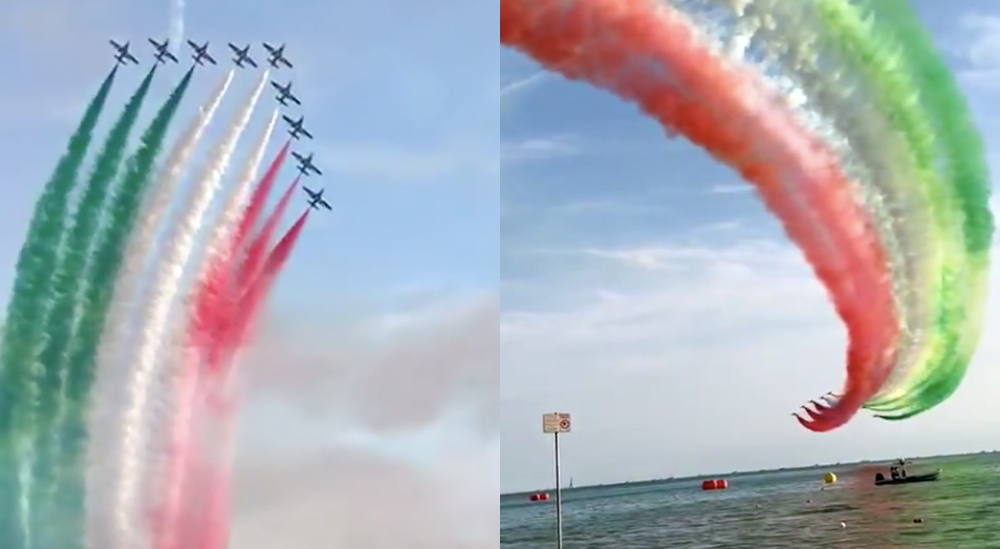 The video shows the team creating the Italian national flag out of colored smoke, to the accompaniment of Luciano Pavorotti’s “Nessun Dorma” from the Italian opera Turandot.