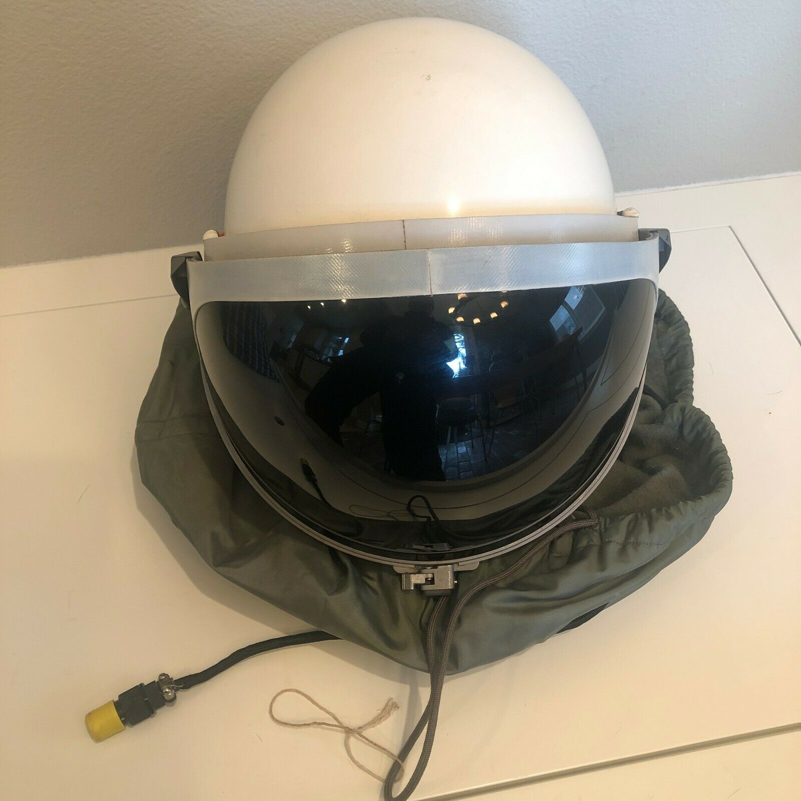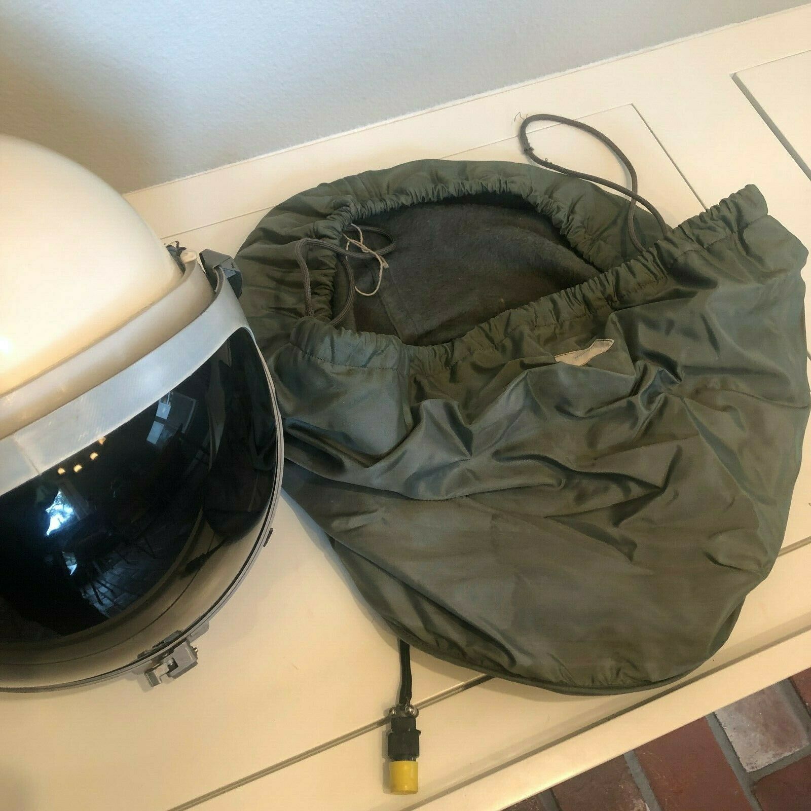 “The face shield had a small electrical wire that ran over to the communications port and was integrated with the communications system for the helmet from the inside. The outer/second visor on the helmet was the sunshield, and it was a dark green. This was nothing more than one great big sunglass lens, almost as dark as the shade on a welder’s mask.