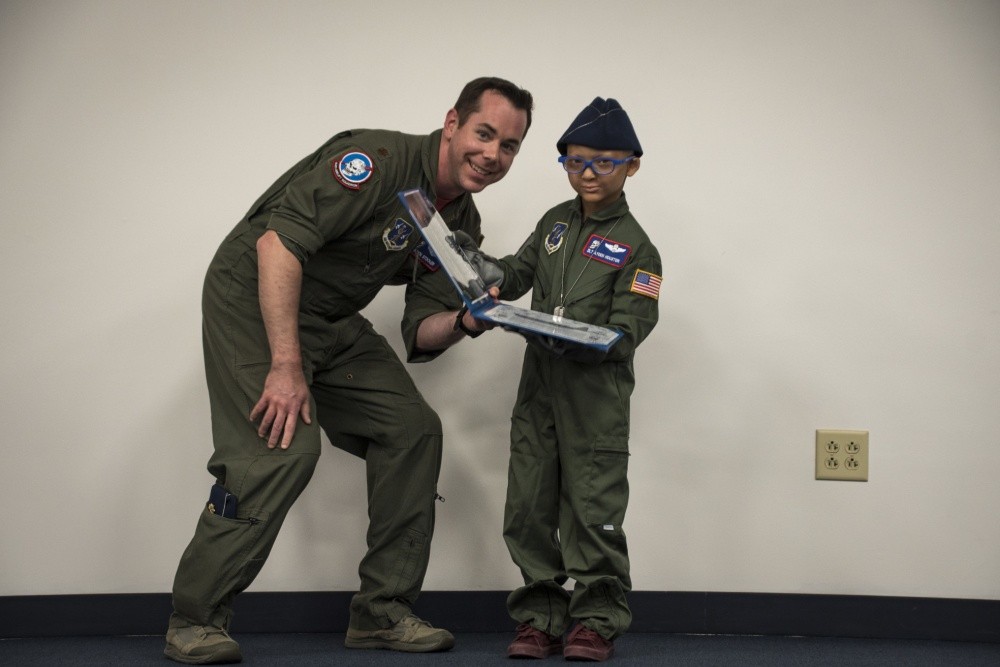 The day started with an honorary induction ceremony where Col. Todd Thomas, 179th Airlift Wing commander, asked Ayden to raise his right hand and swear to mom that he would have as much fun as possible while performing his duties as an honorary 164th Airlift Squadron pilot for the day.
