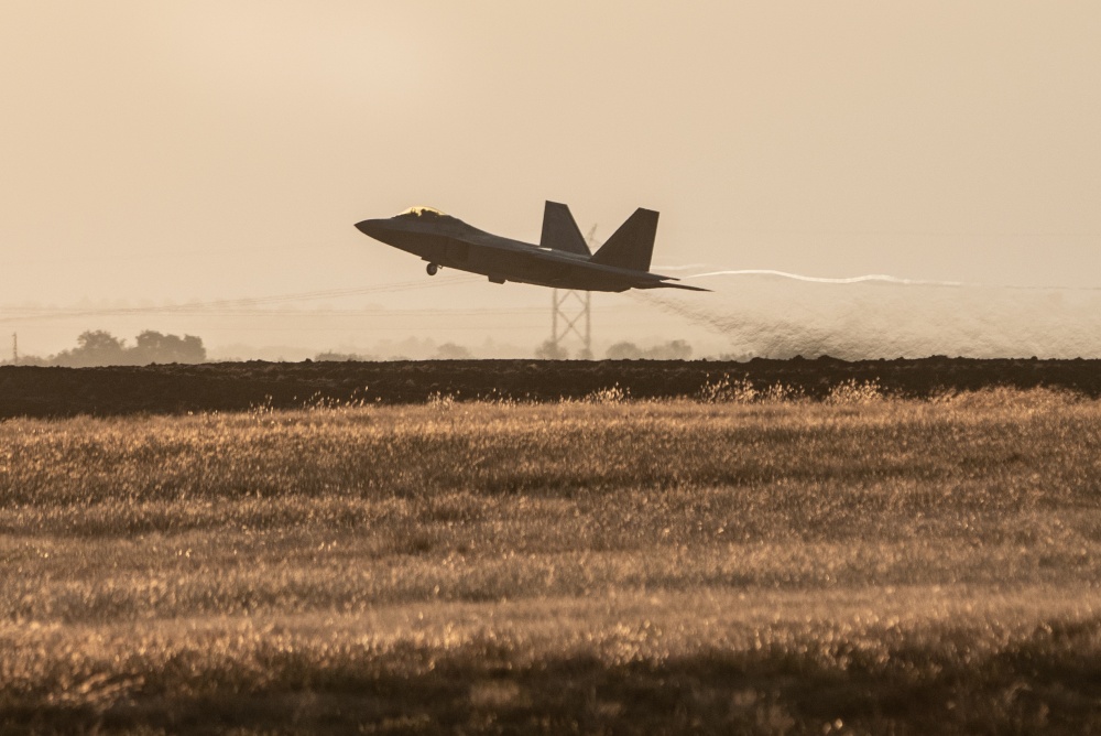 A U.S. Air Force F-22 Raptor takes off at sunrise while at Sheppard Air Force Base (U.S. Air Force photo by 2nd Lt. Sam Eckholm).