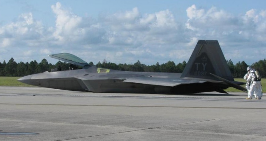 The Raptor was damaged on May 31, 2012, when a trainee pilot was conducting touch and go landings at Tyndall Air Force Base, Florida. According to the Air Force Accident Investigation Board’s findings, the pilot failed to accelerate the jet to military power and engaged “premature retraction of the landing gear.” Without enough thrust, the F-22, known by its USAF serial number 02-4037, fell back down to Earth and skidded on its belly for 2,800 feet. The pilot escaped from the damaged aircraft after it stopped, suffering only minor injuries. The pilot was reportedly only on his third flight in an F-22 when the accident occurred.