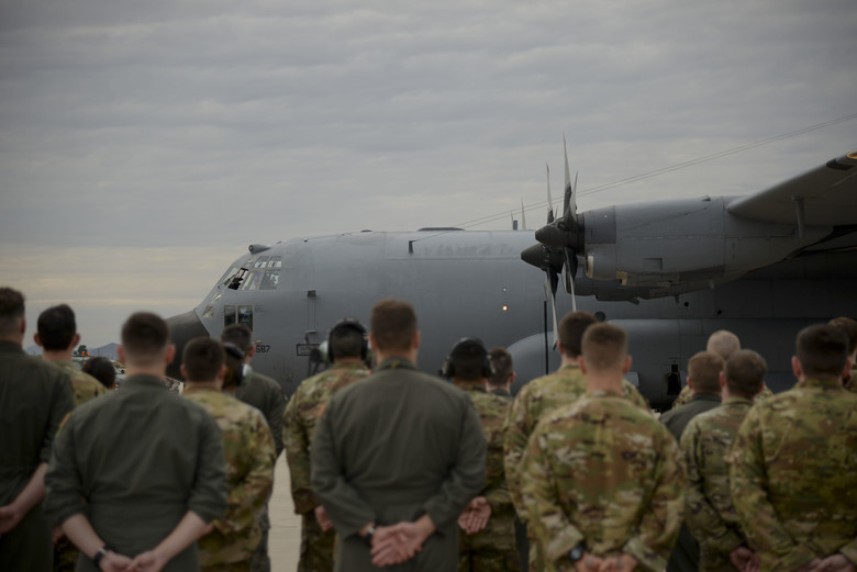 Members of the 55th Electronic Combat Group stand in formation during the final flight of an EC-130H Compass Call at Davis-Monthan Air Force Base, Arizona. (U.S. Air Force photo by Senior Airman Christina Rios)