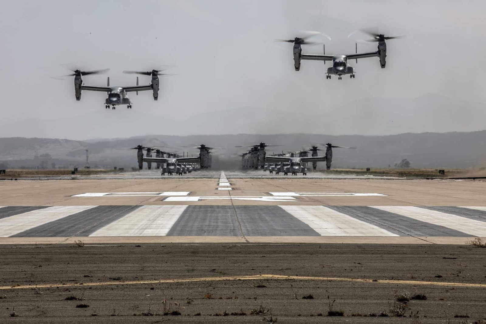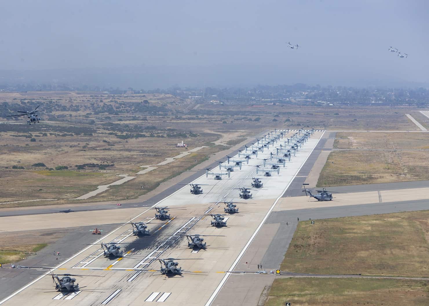 The Marine Corps carried out a huge ‘elephant walk’ exercise with its MV-22B Osprey tilt-rotor aircraft and CH-53E Super Stallion helicopters in California earlier this month.