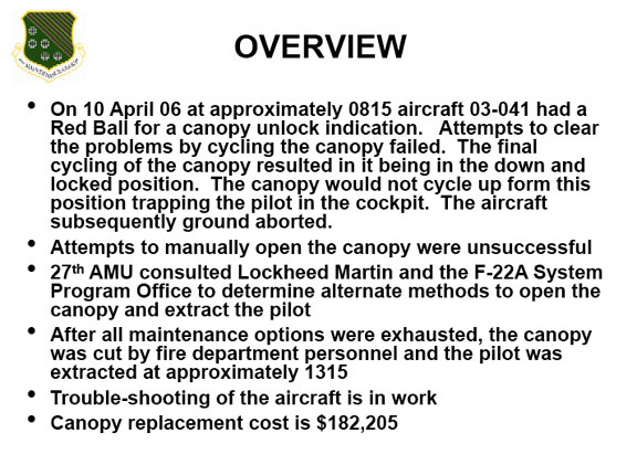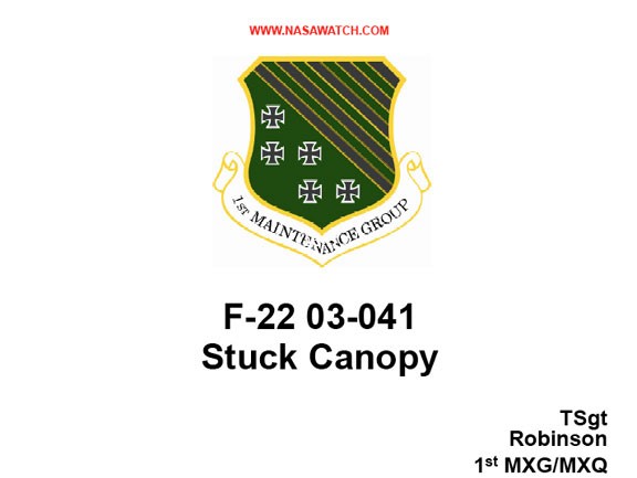Status F-22 03-041 Stuck Canopy Report by TSgt Robinson 1st MXG/MXQ