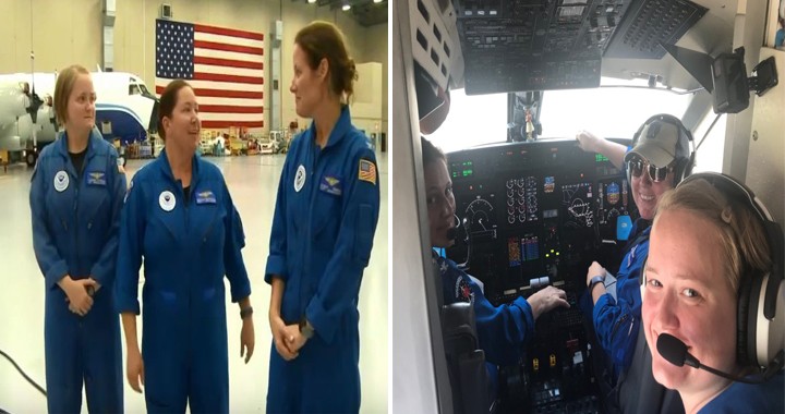 The all-female pilot crew was comprised of Captain Kristie Twining, Commander Rebecca Waddington, and Lieutenant Lindsey Norman. The women piloted a seven-and-a-half-hour flight to collect data on the storm as it gathers steam and heads toward Florida.