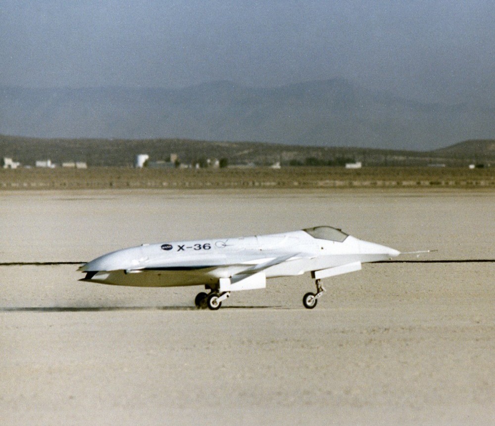 In the Above photo NASA/McDonnell Douglas Corporation (MDC) X-36 Tailless Fighter Agility Research Aircraft undergoes high-speed taxi tests on Rogers Dry Lake at NASA Dryden Flight Research Center, Edwards, California, on October 17, 1996.
