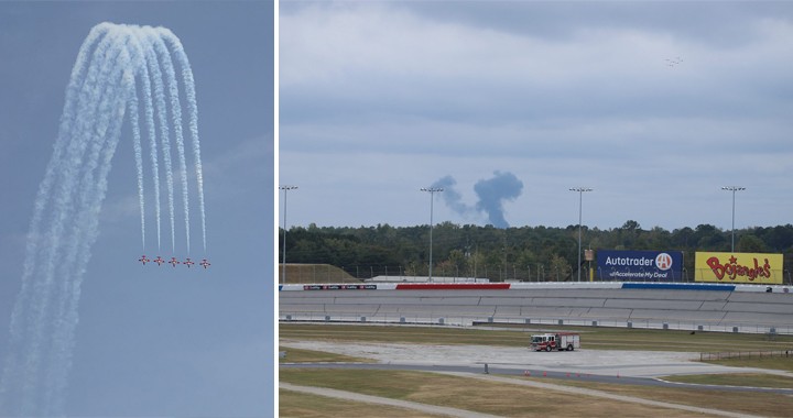 A Canadian Force Canadair CT-114 Tutor, operating for the Snowbirds demo team as #5, crashed shortly before their performance at the Atlanta Motor Speedway.