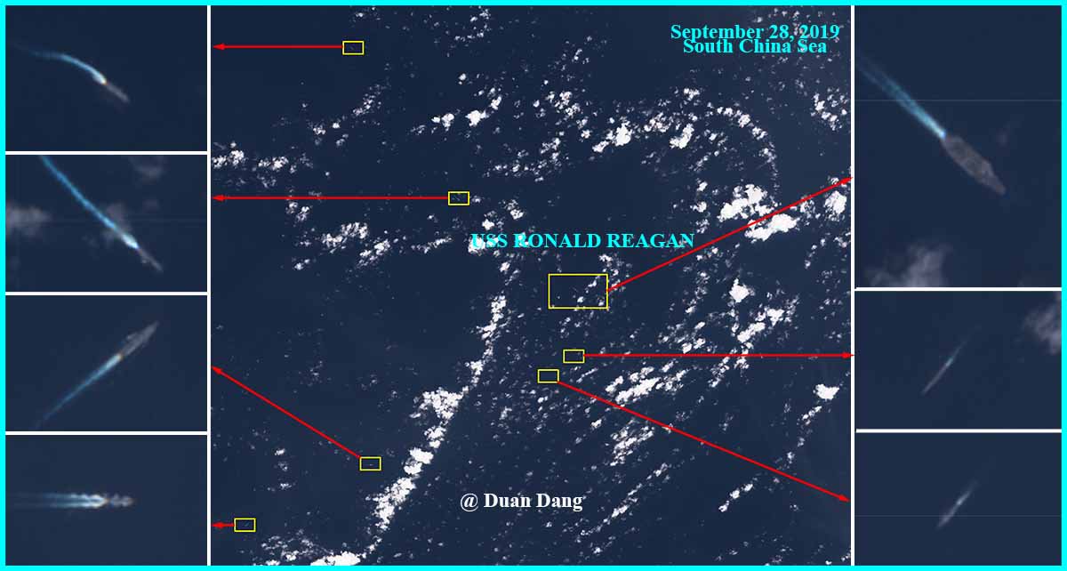 A Chinese Weibo social media user published a satellite image allegedly showing U.S Navy aircraft carrier the USS Ronald Reagan surrounded by at least seven other, purportedly Chinese, warships on 24 September.