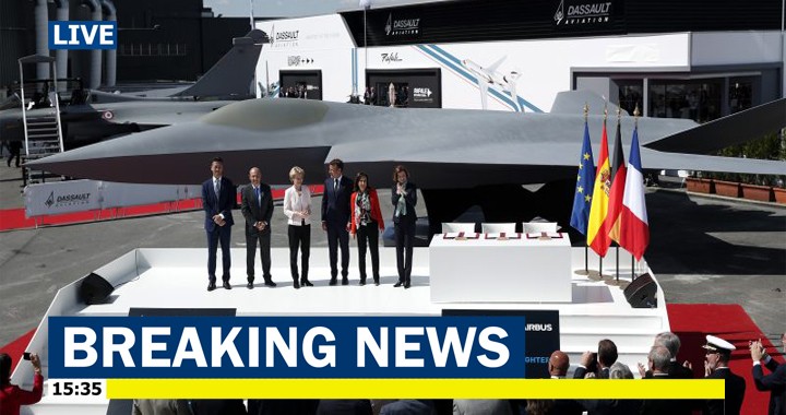 Dévoilement au Bourget du projet d'avion de combat du futur en présence du président #Macron et des ministres de la défense espagnole et allemande. Coopération internationale sous la bannière Dassault et Airbus pour l'horizon 2030 pic.twitter.com/8SVmErR4sC