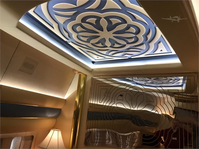 The aircraft has a tasteful, but far more austere interior than what is commonly found on other VIP aircraft, and especially 747s. It is more of a mix of first and business class seating, work areas, a unique elevated area for in-flight press conferences, and an office area.