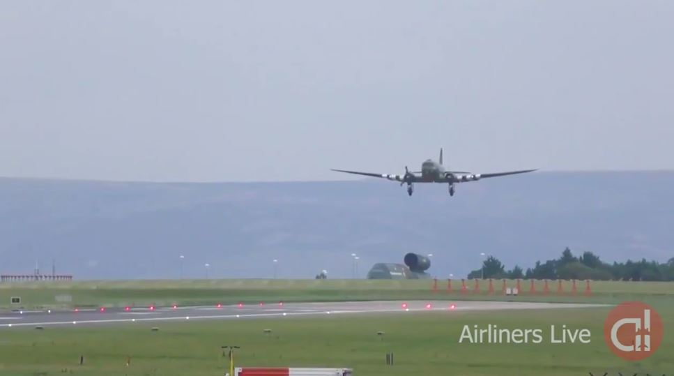 On Twitter, British Airshow Review posted: “The Battle of Britain Memorial Flight (Official) Dakota was expected to conduct various flypasts this afternoon but has had to make an emergency landing at Manchester Airport due to an engine failure on the number two engine.”