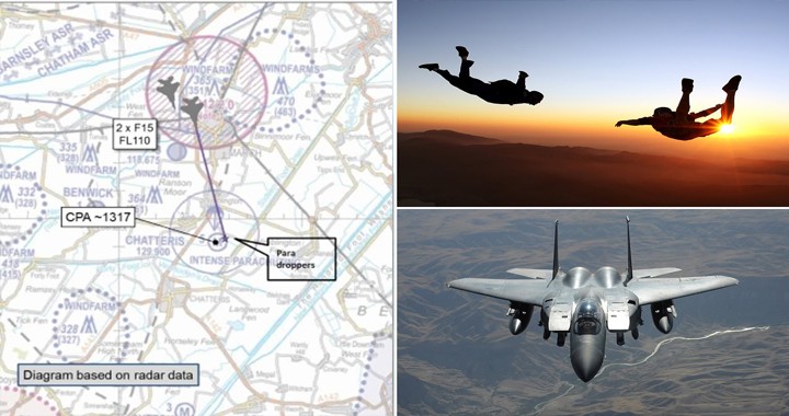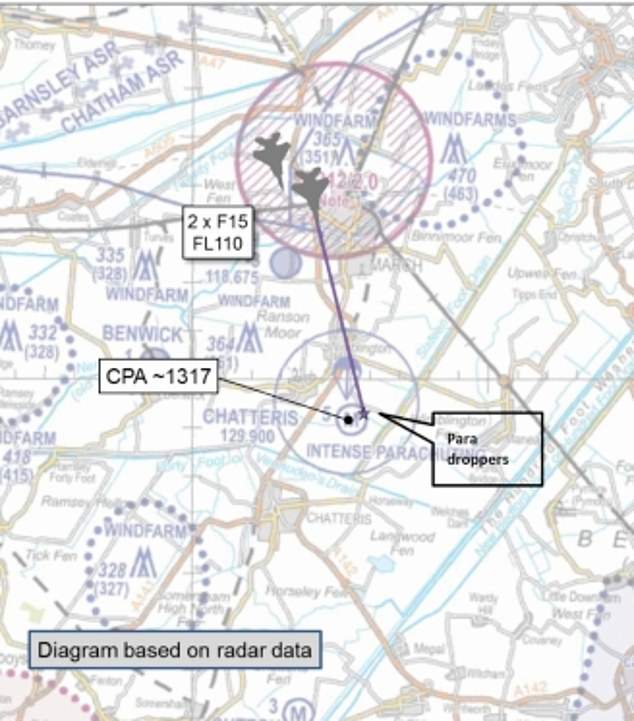 A map shows the position of the F15 fighter jets (marked with a star) when they nearly collided with two skydivers (marked next to jets)