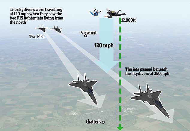 The two freefallers could have been killed instantly had they hit the F15 fighter jets as they tumbled through the air over the Cambridge town of Chatteris on April 17.