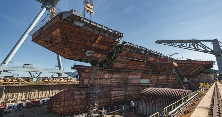 Future aircraft carrier #USSJohnFKennedy #CVN79 reaches 50 percent structural completion with lower stern's addition. (Via @hiindustries) pic.twitter.com/oSGciDelRN
